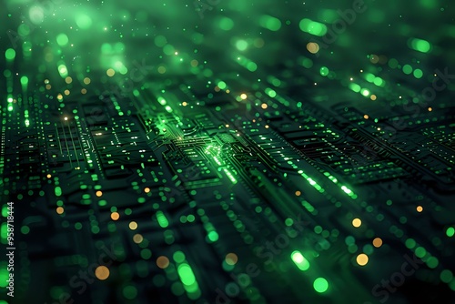 An abstract digital background with interconnected green and yellow glowing particles, symbolizing technology, data, and networking. Ideal for tech, science, or futuristic-themed projects.