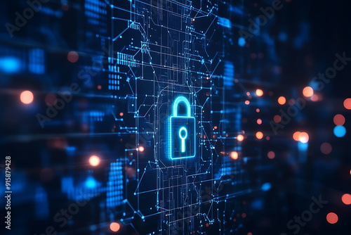 An abstract digital cyber lock background featuring a stylized lock design with interconnected data points and circuit patterns