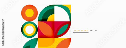 An abstract geometric design featuring colorful circles and squares arranged in a pattern with symmetry on a white background, inspired by visual arts