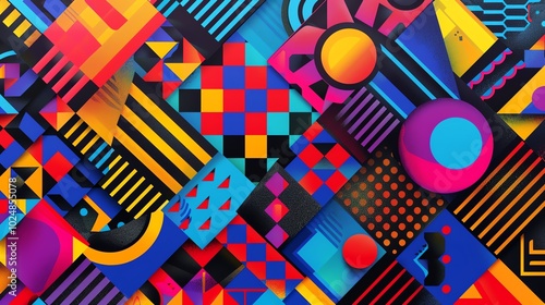 An abstract geometric pattern with various colors, shapes, and textures.