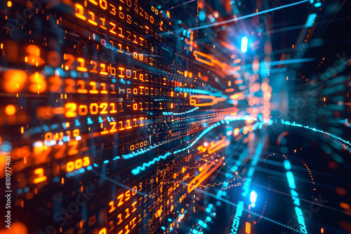 An abstract representation of an algorithm at work within the azure cloud, showcasing the complexity of technology and coding, intertwined with data streams and binary code Created