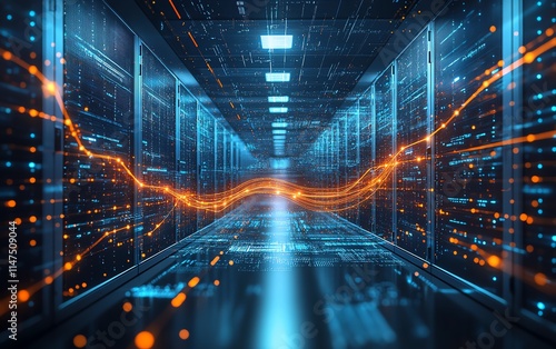 An abstract representation of law scales intertwined with digital patterns, set against a background of servers and AIdriven visuals in a hightech data center