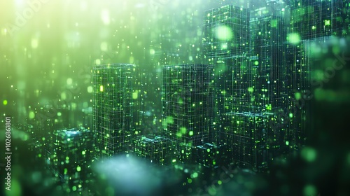 An abstract technology design background in light blue and green showcases modern digital aesthetics.