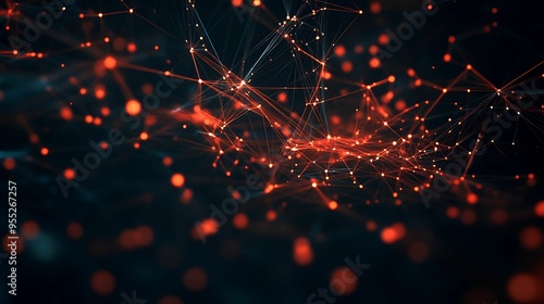 An abstract visualization of a digital network with glowing red nodes and interconnected lines, symbolizing data communication and technology.
