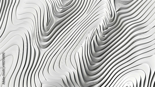 An abstract white and grey background with a 3D layered wave pattern.