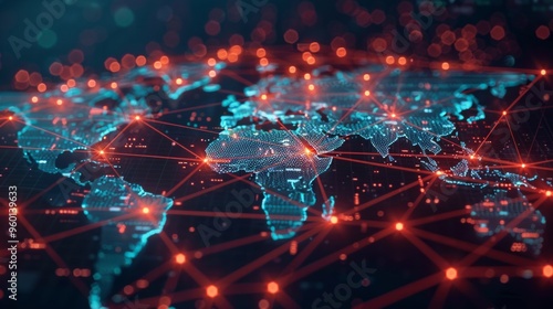 An abstract world map emphasising global connectivity through technology. Highlighted regions, red dots and orange lines symbolise communication networks.