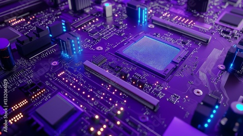 An advanced violet electronic board with metallic silver nodes, glowing blue processors, highly detailed circuits forming an intricate motherboard design.