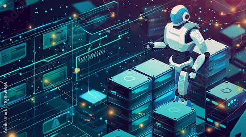 An AI robot interacting with data servers in a digitally advanced environment, symbolizing the integration of artificial intelligence and data management in modern tech industries.