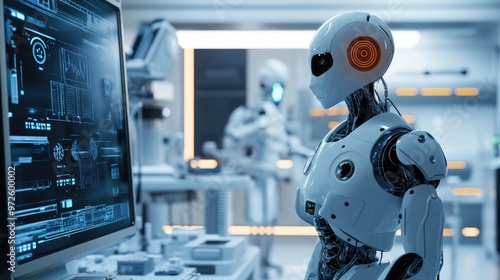 An AI robot stands in a science lab, looking at its reflection in a large mirror, surrounded by advanced equipment and research tools