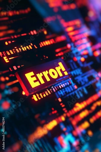 An alarming red Error! alert in the middle of the code on a computer screen, depicting system issues