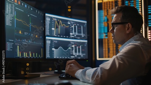 An analyst uses a computer and dashboard for data business analysis and Data Management System with KPI and metrics connected to the database for technology finance operations sales ma : Generative AI