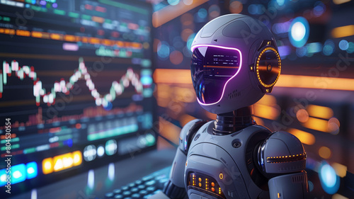an artificial inteligence representation of a robot stading in front of a computer with a crypto chart opened on the screen,generative ai