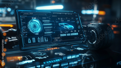 An auto mechanic using an OBD2 wireless scanning tool to check the engine system, with car information displayed on a screen interface, illustrating the concept of car maintenance service.