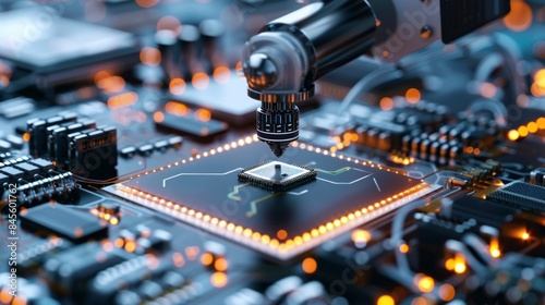 An automation system oversees the production of silicon wafers and microcircuits, utilizing an automated robot arm for precise control and efficient operations.