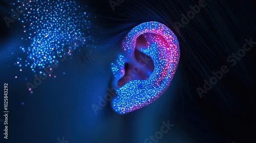 An ear is illuminated with blue and red dots on the skin