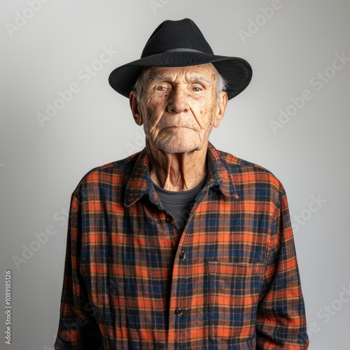 An elderly man in a plaid shirt and black hat stands against a white isolated background.