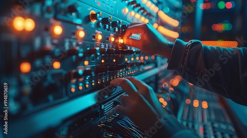An engineer adjusting server settings on a control panel, front view, precise cable connections, glowing server lights, well-organized equipment. Sharp focus, high-tech, professional setting.