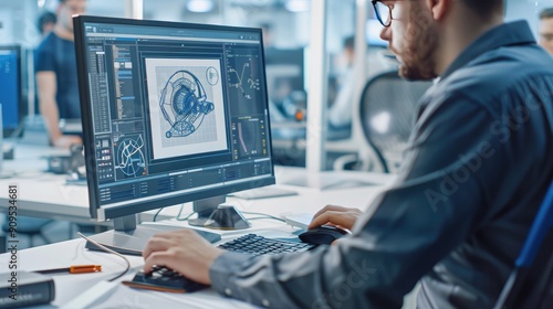 An engineer uses technical design software on a computer, focusing on intricate diagrams and engineering plans in a modern workspace..