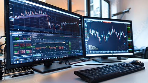An ergonomic workspace with dual monitors, one displaying stock market trends and the other a presentation, next to a wireless keyboard and mouse.