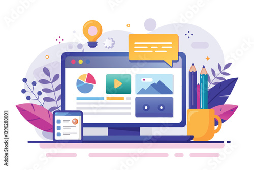 An illustration depicting a desktop computer with a bright screen displaying a chart, video player, and image.