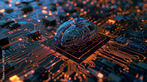 An illustration of a brain made of metal and wires on a circuit board. The brain is glowing and there are binary numbers flowing around it.