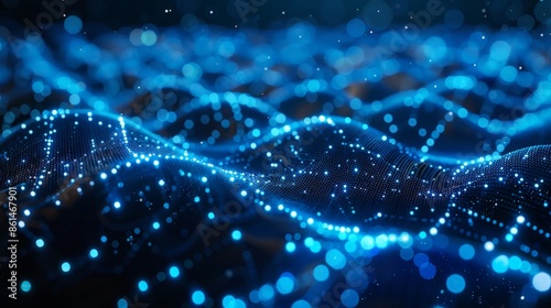 An image displaying a digital abstract representation of data visualization with blue glowing nodes and wave patterns.