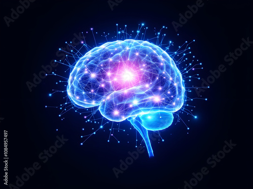 An image of a digital brain with neural connections, resembling a complex network of nodes.