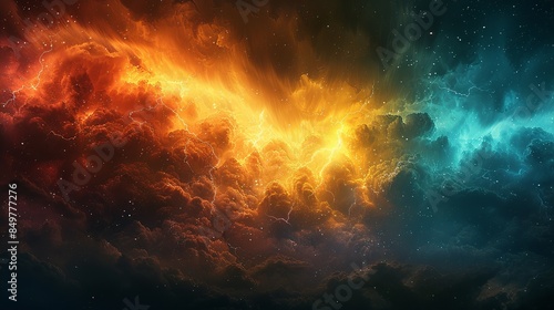 An image of a sky painted with dark, ominous clouds filled with fury, lightning bolts illuminating the stormy expanse, torrential rain pouring down, and a rainbow appearing, bridging the storm's