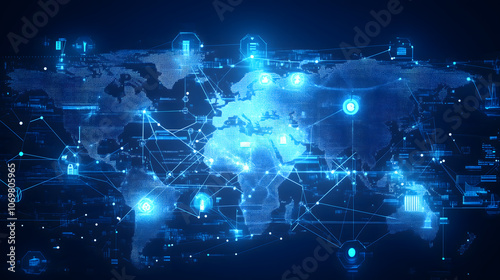 An image of a world map overlaid with interconnected lines and nodes, representing global shipping routes and data flow. The map features glowing lines to signify real-time data and technological int