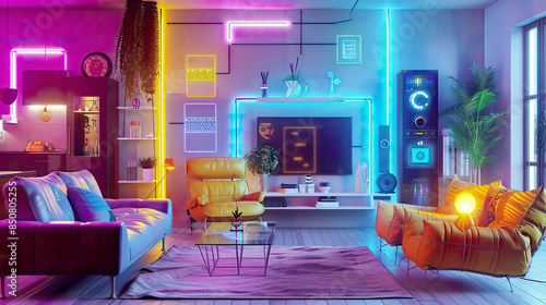 An immersive depiction of a smart home interface with an AR view of IoT objects within a sophisticated interior a modern living room with various IoT devices