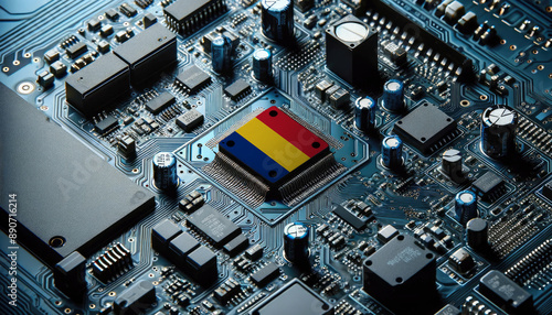 An intricate microchip with the Romania flag embedded, representing the innovation and technological advancements of the Romania in the field of electronics and microtechnology