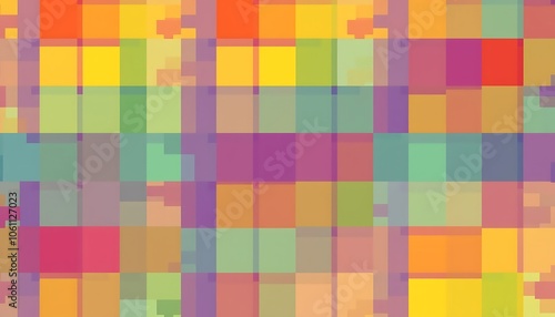 An intricate pattern of squares and rectangles in a spectrum of colors, overlapping to form a vibrant tapestry.