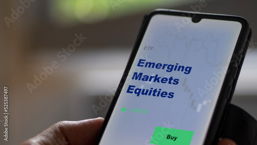 An investor's analyzing the emerging markets equities etf fund on screen. A phone shows the ETF's prices BRIC BRICS equity to invest