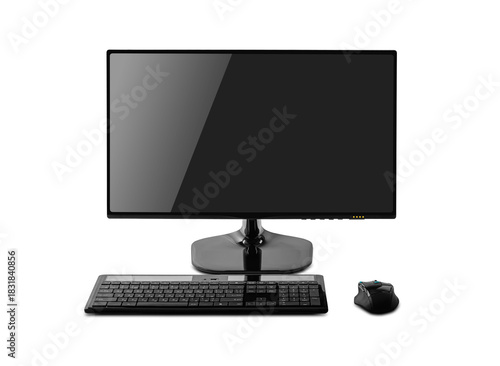 An isolated, modern, black desktop computer monitor, keyboard, and mouse are positioned centrally on a pure white background, ready for use.