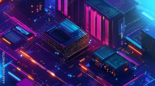 An isometric view of network computing technologies in a digital space, where a data center offers high-performance data storage and processing for big data analysis and machine learning.
