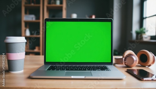 An Open Laptop with a Chroma Key Green Screen Set Up on a Wooden Desk in a Contemporary Office Environment.