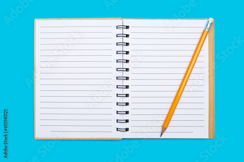 An open notebook with a binding and a yellow pencil on a blue background. Open notepad with blank sheets. Free space for text. Blank notebook pages ready to be used in design. Blank sheets of notebook