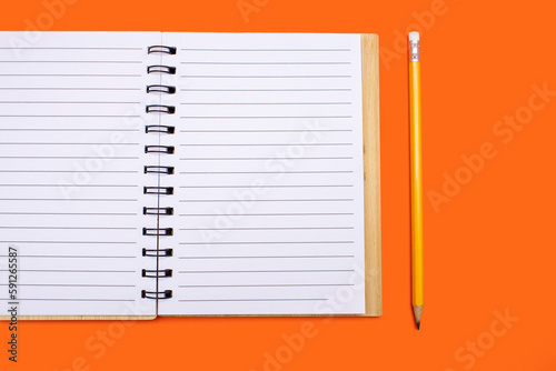 An open notebook with a binding and a yellow pencil on an orange background. Open notepad with blank sheets in top view. Free space for text. Blank notebook pages ready to be used in design