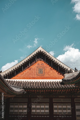 an orange brick building with some white windows in front of blue skies