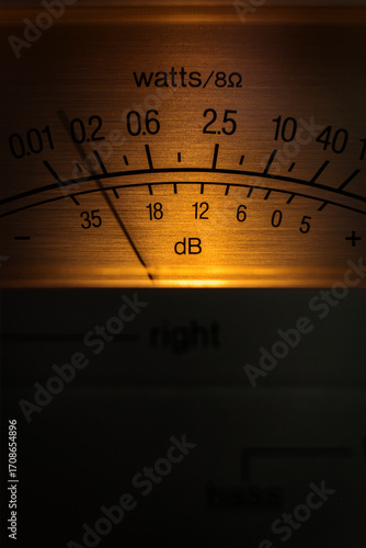 Analog Watt Meter Displays Power Output and Db Levels in Dark Setting