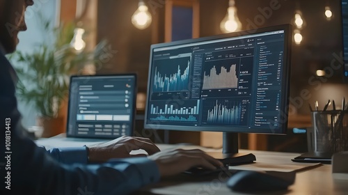 Analyst working with Business, Concept digital transformation technology strategy, Analytics and Data Management System on computer, make a report with KPI and metrics connected to database.