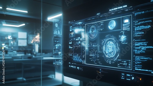 Analyzing Futuristic Interface on Screen in High Tech Laboratory Environment