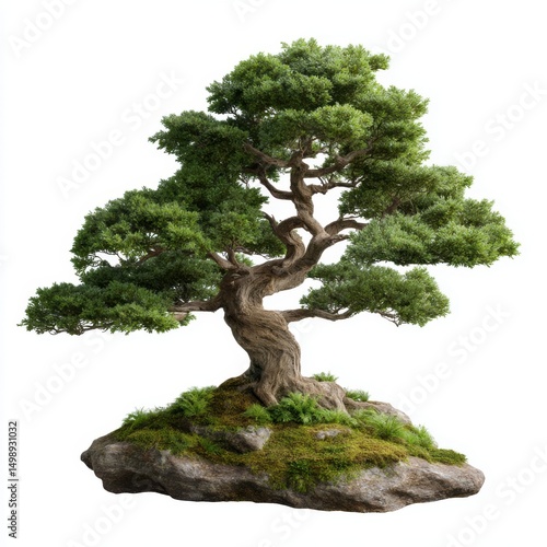 Ancient bonsai tree on rock isolated on white background
