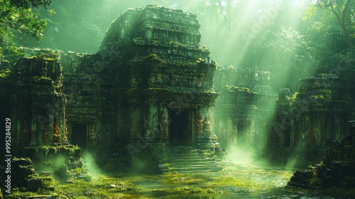 Ancient temple ruins surrounded by lush greenery and mist.