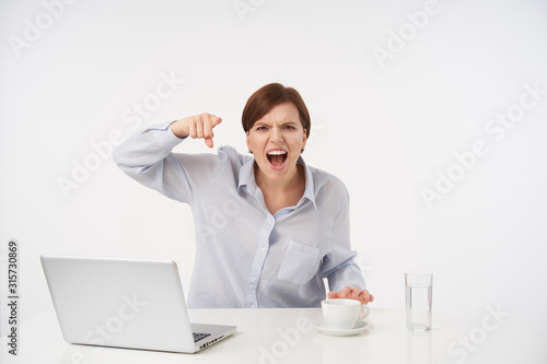 Angry young pretty brown haired female with short trendy haircut shouting fiercely with wide mouth opened and pointing to camera with index finger, isolated over white background