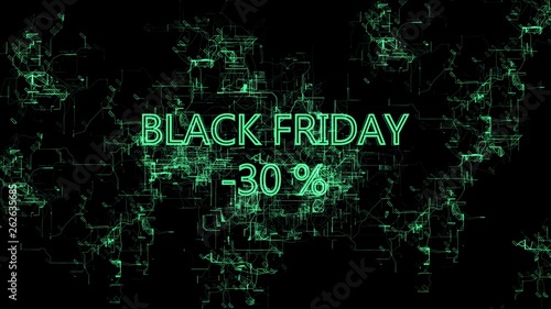 Animation of the Digital Network. Sign 'Black Friday -30 percent'. Green wires, black background