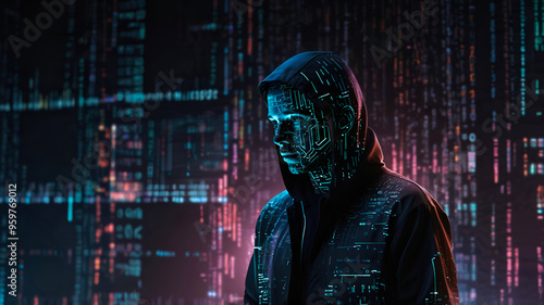 Anonymous binary code hacker under the jacket hood with generative ai technology. Cybersecurity concept