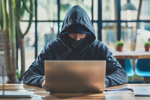 anonymous computer hacker wearing a dark hoodie, stealing data from a laptop. ai generative