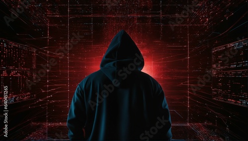 Anonymous hacker in black hoodie with network of glowing data and intricate code