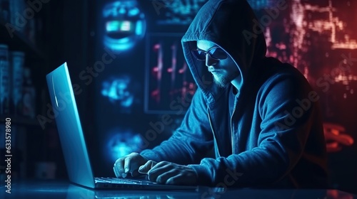 Anonymous hacker programmer coding at the laptop computer Internet security. Cyber attack business man in hooded shirt using computer against dark background